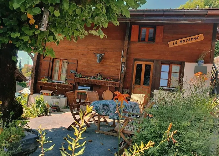 Chalet Le Muveran Gryon ligt binnen 2 km van het Sportcentrum Villars en nodigt gasten uit om te ontspannen op een terras.